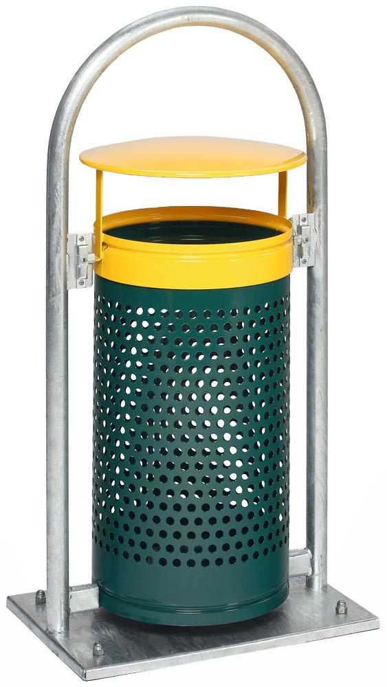 ∙ Für 60/70 l Kunststoffsäcke ∙ Kopfteil und Korpus aus verzinktem Stahlblech pulverbeschichtet oder Stahlblech feuerverzinkt ∙ Rohrbogen, Bodenanker und Grundplatte verzinkt ∙ Verriegelung des Korpus mit zwei Schlössern zum Schutz vor unbefugtem Öffnen ∙ Kopfteil dient gleichzeitig als Klemmvorrichtung für den Kunststoffsack ∙ Behältervolumen 65 l