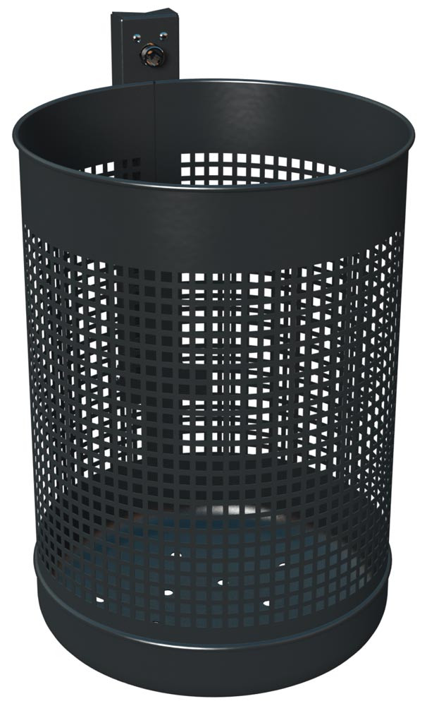 ∙ Gefertigt aus Stahlblech ∙ Gelochter Korpus ∙ Geeignet zur Wand- und Pfostenmontage ∙ Volumen ca. 20 oder 50 l ∙ Behälter-Ø 265 oder 370 mm, Höhe 410 oder 520 mm ∙ Gewicht inkl. Befestigungsschiene ca. 4,0 oder 5,5 kg ∙ Erhältlich in feuerverzinkt oder feuerverzinkt und zusätzlich pulverbeschichtet ∙ Lieferumfang: Abfallbehälter, Befestigungsschiene und Schlüssel (Befestigungsmaterial siehe Zubehör)