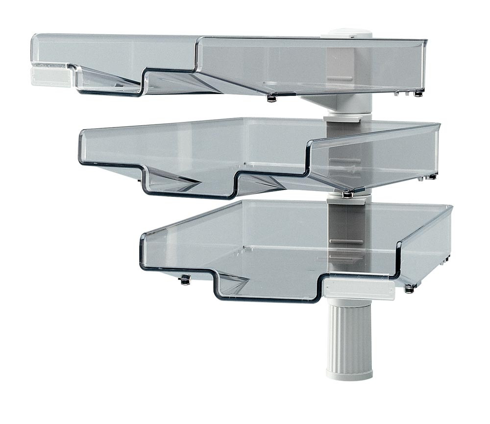 · Transparente Kunststoff-Ablagekörbe · Längs und quer montierbar · Schwenkbar um 360° · Geeignet für Unterlagen max. 240 x 340 mm · Befestigung am Tisch mit Klemmzwinge · Klemmbereich 20-72 mm