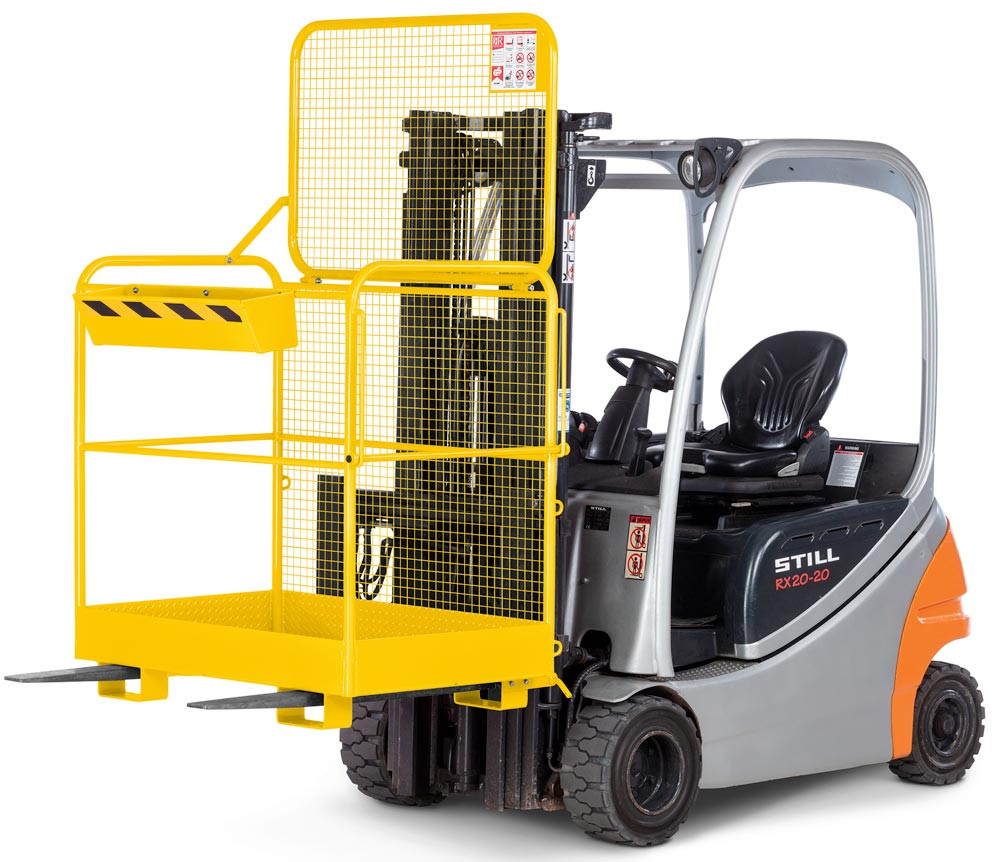 · TÜV geprüfte Sicherheit, entsprechend der DGUV (Deutsche gesetzliche Unfallversicherung) · Stabile Stahlkonstruktion mit rundum Absturzsicherung aus Rohr gemäß UVV · Arbeitskörbe mit TÜV-Zulassung für 2 Personen · Arbeitsplattform aus rutschsicherer Tränenblechkonstruktion mit Abrollschutz · Steckbolzensicherung verhindert das Abrutschen von den Gabelzinken · Pulverbeschichtet · Verzinkte Ausführung auf Anfrage lieferbar ∙ Klappbar auf der Seite der Einfahrtaschen