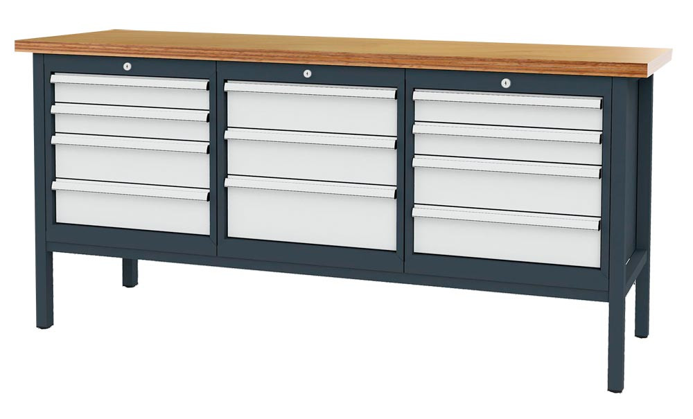 Kastenwerkb., Pl. Multiplex 40 mm, Schubladen 2x75, 2x100, 2x150, 2x175 mm, 1 Fachboden, BxTxH 2000x600x960 mm, RAL 7016/7035 E6490333