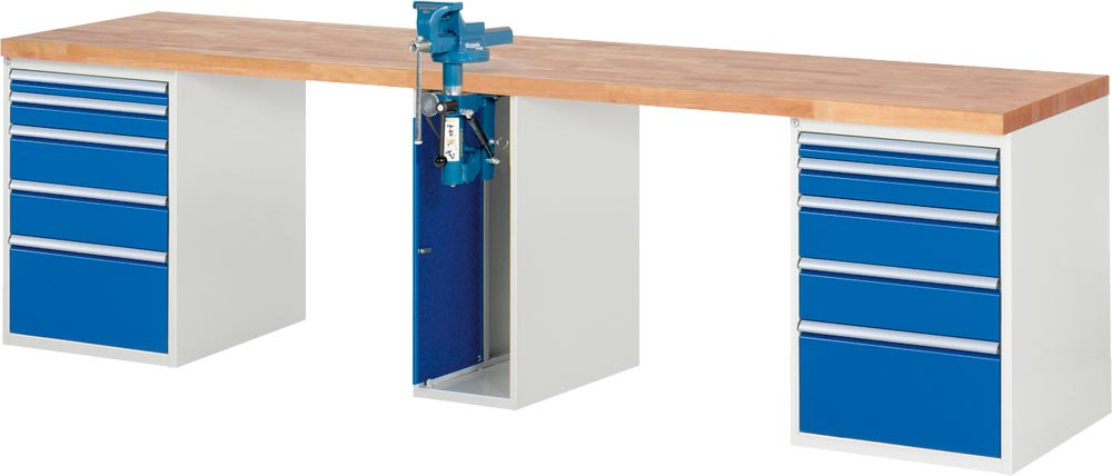 Baukastenwerkbank, BxTxH 2500x900x890 mm, Platte Buche , 2 Blocks, 1 Schraubstock, 10 Schubl. 2x60 mm, 2x90 mm, 4x150 mm, 2x270 mm, RAL 7035/5010 E6490608