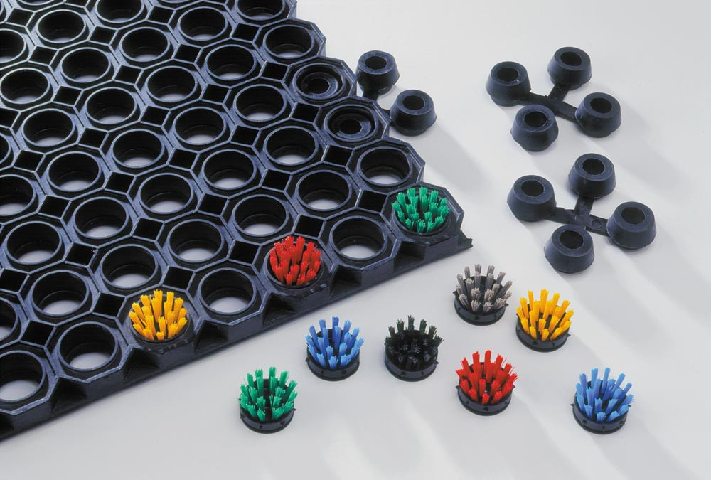 ∙ Bürsteneinsätze zur Verbesserung der Reinigungsleistung und farblichen Gestaltung der Gummiwabenmatten · Lieferbar in schwarz, blau, gelb, grün und rot