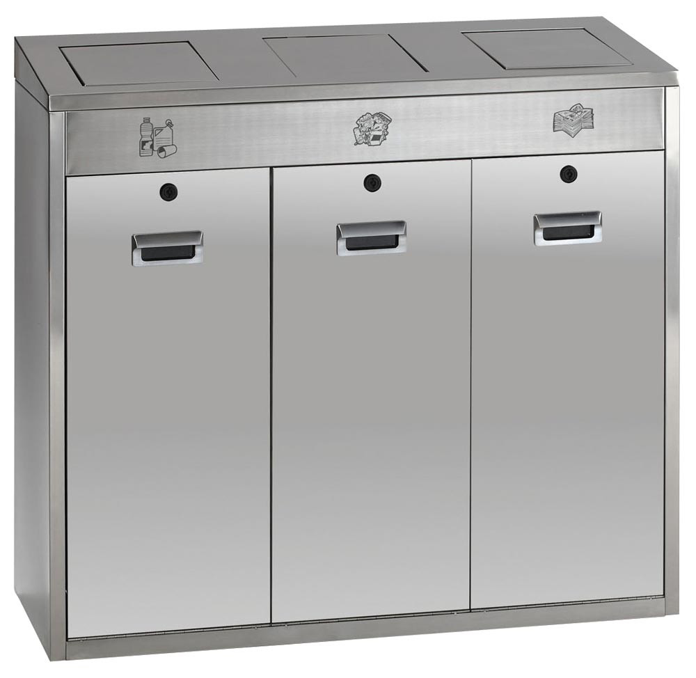 · Gefertigt aus Edelstahlteilen · Mit 3 selbstschließenden Einwurfklappen und Kennzeichnung für die Wertstoffsortierung · Piktogrammaufkleber für Wertstoffe, Restmüll und Papier · 4 verstellbare Füße für Niveauausgleich · 3 verschließbare Klapptüren mit Doppelbartschloss und Griffmulden · 3 Inneneinsätze mit Bügelgriffen und einem Volumen von je ca. 48 Liter