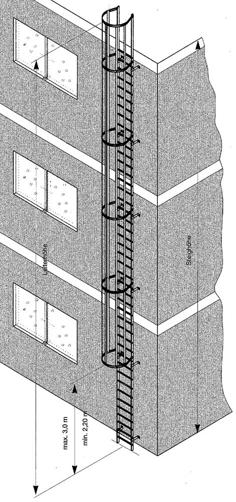 ∙ Zur ortsfesten Montage an Gebäuden entweder zur Wartung nach DIN 18799-1, als Notleiter-Anlage nach DIN 14 094-1 oder als Maschinenzustieg nach DIN EN ISO 14 122-4 ∙ Rückenschutzkorb als Sicherungssystem, bei jeder Norm einsetzbar ∙ Steigschutzschiene als Sicherungssystem gem. DIN EN 353-1, nach DIN 18 799-1 und DIN EN ISO 14 122-4, auch bei mehr als 10 m Steighöhe als einzügige Steigleiter ausführbar ∙ Leiterbreite 520 mm ∙ Wandhalter mit verschiedenen Wandabständen bis 600 mm wählbar ∙ Der Abstand der Wandhalter untereinander beträgt max. 2 m ∙ Jedes Leiterteil muss mind. mit 2 Wandhalterungen montiert werden ∙