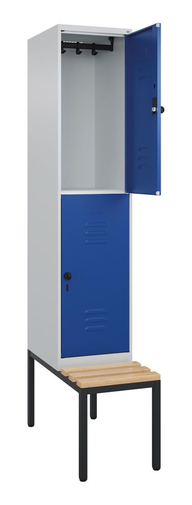 Fächerschrank, untergeb. Sitzbank, BxTxH 300x500x2120 mm, 1x2 Fächer, Abt.B 300 mm, doppelstöckig, Bucheleisten, Drehriegel, RAL 7035/5010 E6479162