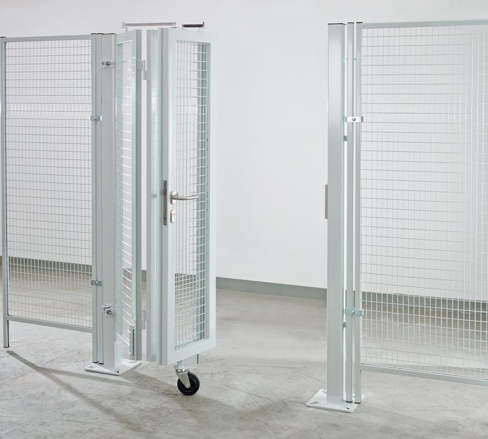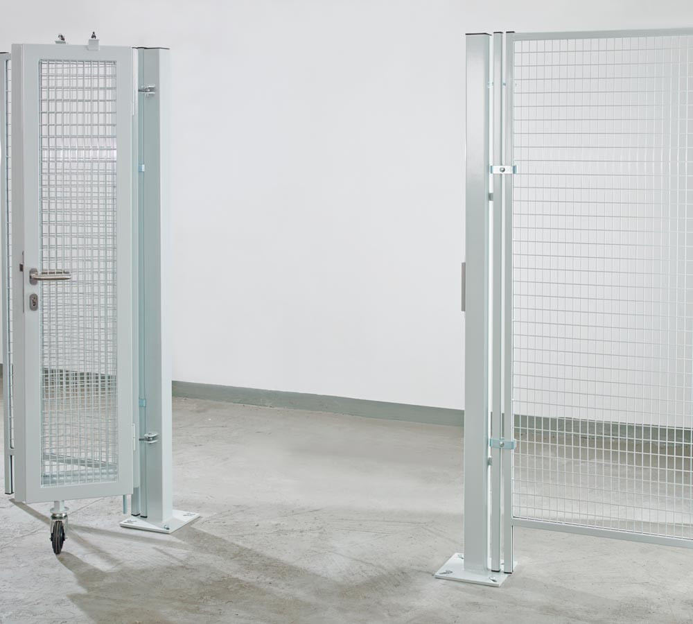 · Optimaler Schutz in Bereichen mit wenig Platz · Flachgittermaschung 40 x 40 mm in Rahmenprofil 60/40 mm eingefasst · Direkt in das Trennwandsystem integrierbar · Leichtes Öffnen und Schließen durch drehbare Räder · Komplett ausgestattet mit Torrahmenschloss und Drückergarnitur · Inkl. stabiler QR-Pfosten und verstellbarer Torbänder · Farbe RAL 7037 staubgrau