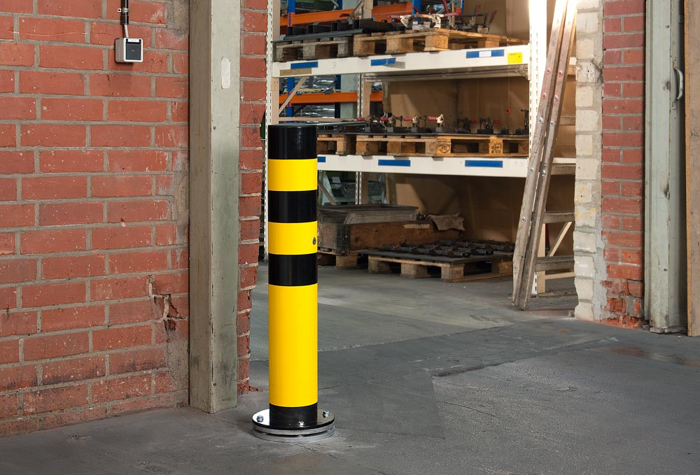 ∙ Extrem belastbarer, flexibler Poller aus Gütestahl ∙ Beim Aufprall schwingt der Poller aus, dadurch wird die Energie direkt absorbiert (progressive Kraftaufnahme) ∙ Zusätzlich Drehbar durch massive Stahl-Bodenplatte mit 6 eingelassenen Kugellagern · Seitliche Kräfte werden durch Drehen, frontale Kräfte durch das Nachgeben absorbiert · Innenliegende Stahlspiralfeder ∙ Fußteil mit PU-Puffer ∙ Rohrdurchmesser 159 mm ∙ Wandstärke 4,5 mm ∙ Bestens geeignet für kritische Einsatzbereiche wie z. B. LKW- und Staplerverkehr, Einfahrten, Gebäudeecken etc. ∙ Zum Aufdübeln mit runder Bodenplatte 270 x 10 mm ∙ Neigung bis 25° (ca. 310 mm) · Farbe gelb mit schwarzen Signalstreifen