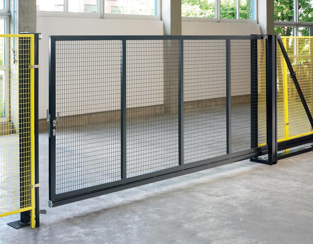· Freier Zugang ohne hinderliche Führungsschienen · Kugelgelagerte Lauf- und Querrollen · Flachgittermaschung 40 x 40 mm · Komplett ausgestattet mit Torrahmenschloss und Drückergarnitur · Inkl. stabiler QR-Pfosten · Farbe RAL 7037 staubgrau
