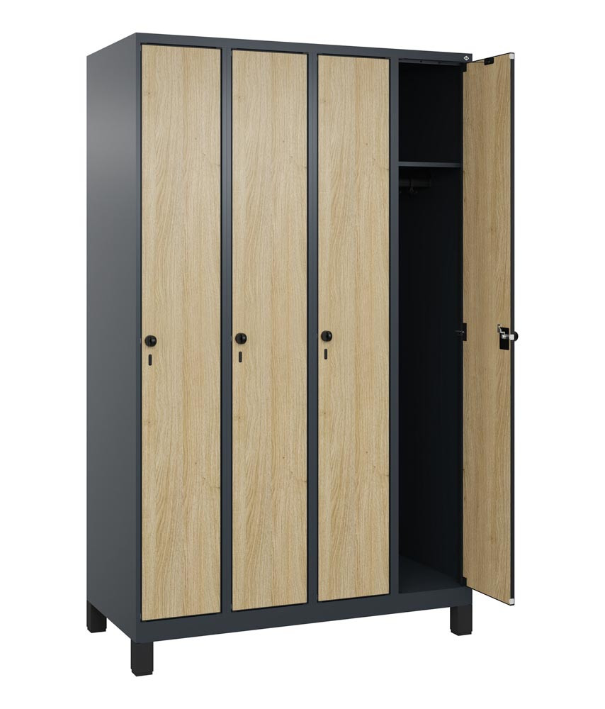 Garderobenschrank, Füße, 4 Abt., Abt.B 300 mm, BxTxH 1200x500x1950 mm, HPL-Dekorfront, RAL 7016/Eiche-Sereno