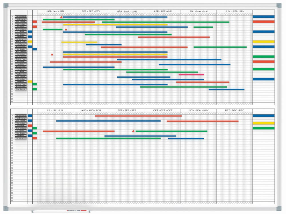 Jahresplaner standard, 600 x 1200 mm Halbjahresübersicht 70 Personen, Ganzjahresübersicht 35 Personen