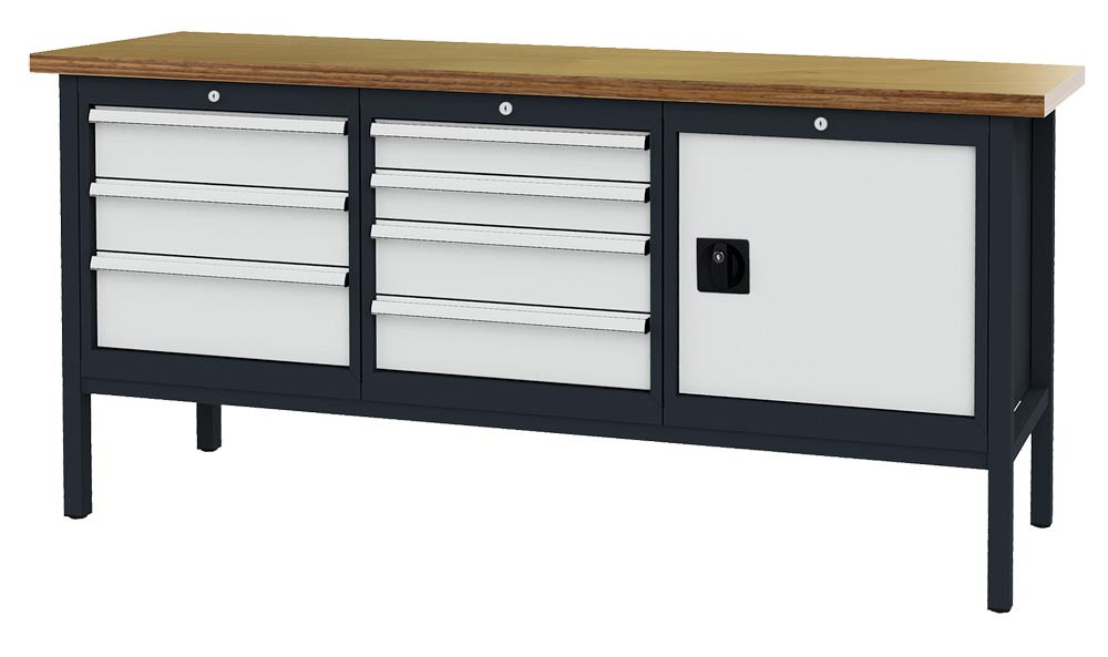 Kastenwerkb., Pl. Multiplex 40 mm, 1 Tür 500 mm, Schubladen 2 x100, 4x150, 1x200 mm, BxTxH 2000x600x960 mm, RAL 7016/7035