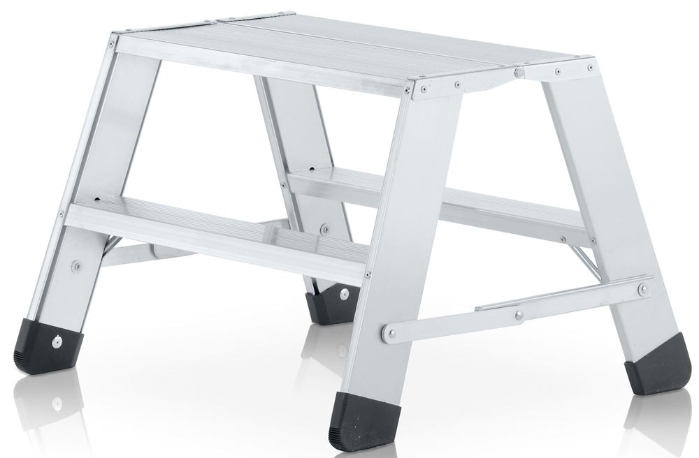 ∙ Alu-Klapp-Tritte beidseitig begehbar ∙ Stabile Plattform 600 x 300 mm Standfläche ∙ Extrabreite Stufen und bequeme Auftrittfläche ∙ 85 mm tiefe Stufen für sicheren Stand ∙ Hohe Stabilität und Verwindungssteifigkeit durch Plattform mit integrierter Scharnierverbindung ∙ Beidseitige, starre Verbindung ∙ Enspricht der EN 14183