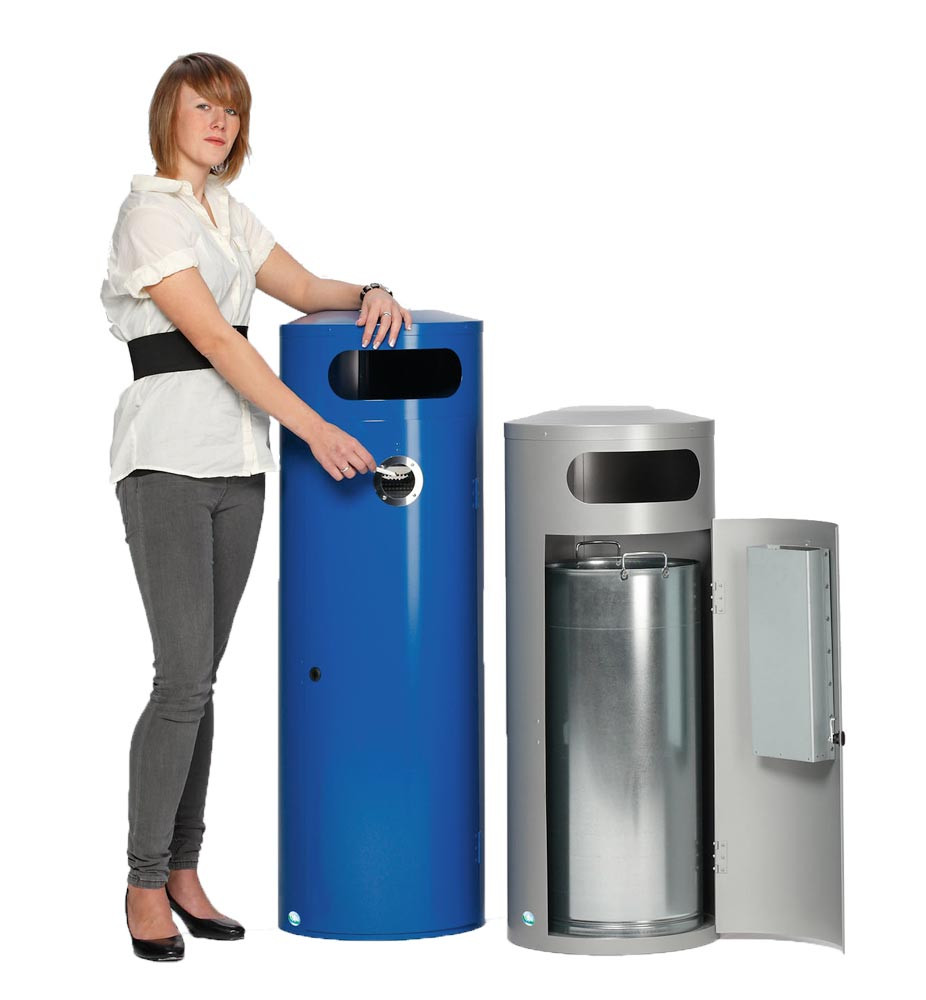 · Gefertigt aus verzinkten Stahlblechen · Oberflächenschutz durch Pulverbeschichtung · Ausgerüstet mit Inneneinsatz aus verzinktem Stahlblech mit Bügelgriffen · Einflügeltür mit Doppelbartschloss und innenliegendem Ascher (Volumen ca. 4,5 L) aus verzinktem Stahlblech, mit Abstreifblech für Zigaretten, abnehmbar · Einwurföffnung in der Tür mit Edelstahl-Ring