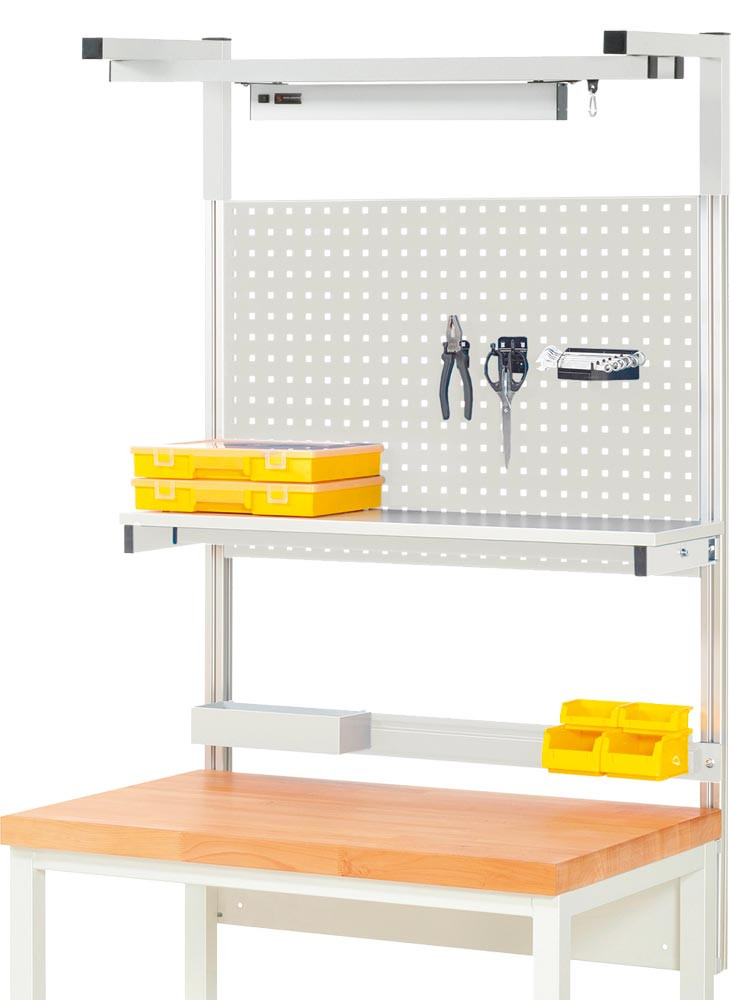 Komplettaufbau für Werkbank B 1500 mm mit Auslegerpaar, 2 x Laufschiene, Laufwagen, LED-Leuchte, Lochplatte H 450mm, Halteschiene, RAL 7035 E6490845