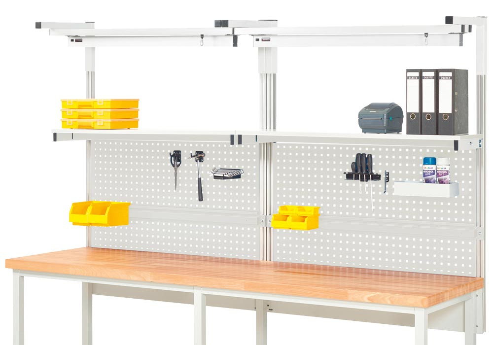 Komplettaufbau für Werkbank B 2000 mm mit Auslegerpaar, 2 x Laufschiene, Laufwagen, LED-Leuchte, Lochplatte H 450mm, Halteschiene, RAL 7035 E6490846