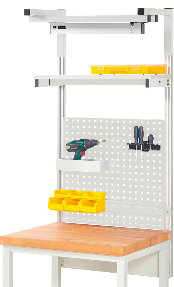 Komplettaufbau für Werkbank B 750 mm mit Auslegerpaar, 2 x Laufschiene, Laufwagen, LED-Leuchte, Lochplatte H 450mm, Halteschiene, RAL 7035 E6490842