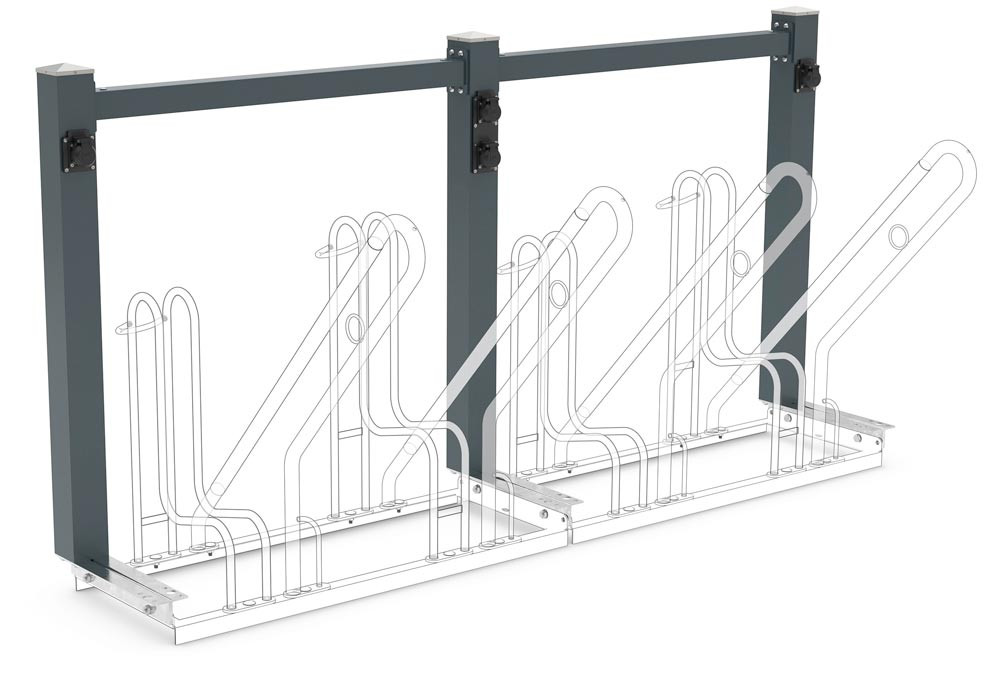 · Zur Nachrüstung an Anlehnbügel · Einfache Montage · Hergstellt aus pulverbeschichtetem Aluminium · RAL 7016 Anthrazitgrau · Eine 230 V Steckdose je Stellplatz · Bitte prüfen Sie vor einer Bestellung, ob die Ladestationen mit den vorhandenen Anlehnbügeln kompatibel ist