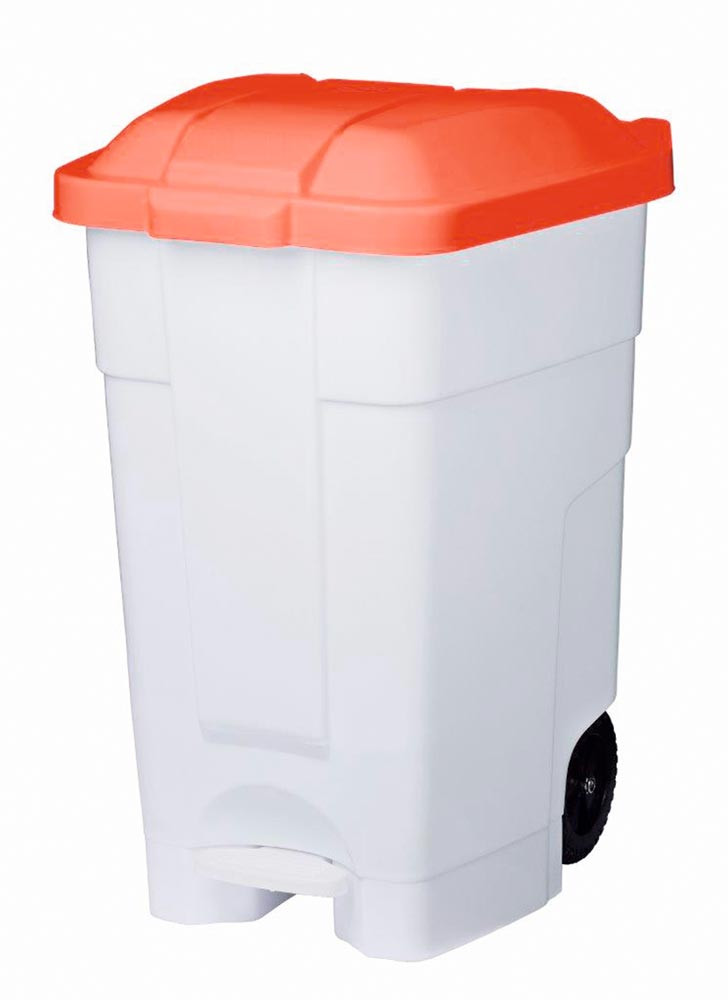· Korpus und Deckel aus Polyethylen hoher Dichte · Öffnungssystem aus Kunststoff · Transportgriff und zwei Räder zum besseren Manövrieren · Breites Fußpedal zur einfachen Handhabung · HACCP konform, robust und einfach zu reinigen · Für 110 Liter Müllsäcke · Wahlweise einfarbig in weiß oder grau, oder mit weißem Korpus und verschieden farbigen Deckeln zu Mülltrennung-/kennzeichnung
