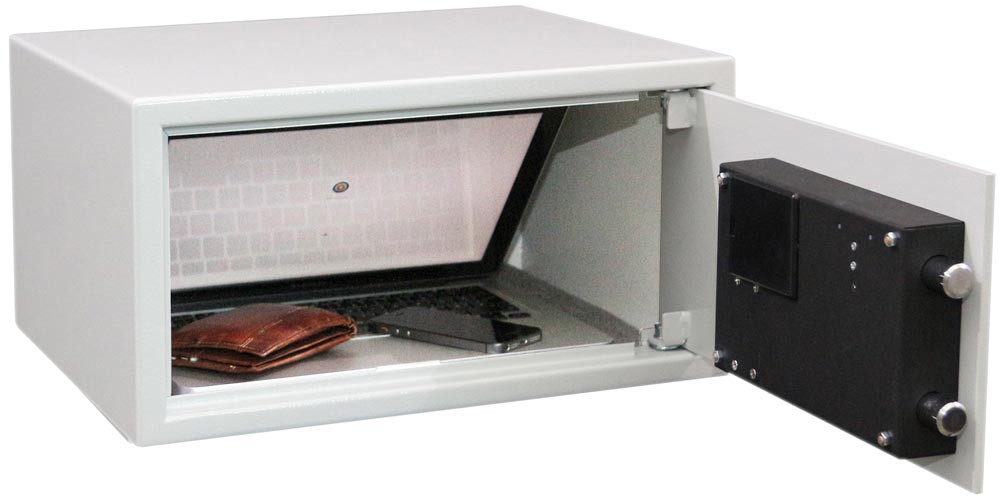 ∙ Korpus und Tür aus hochwertigem, gekantetem Stahl ∙ Tür mit einseitiger Verriegelung durch Rundbolzen ∙ Elektronikschloss mit 6-stelligem LED Display für Status und Codeanzeige ∙ 3- bis 6-stelliger Benutzercode, 3- bis 6-stelliger Managercode ∙ Mechanische Notöffnung (Zylinderschloss mit 2 Schlüsseln) ∙ Verriegelung mittels Motorschloss ∙ Je-
