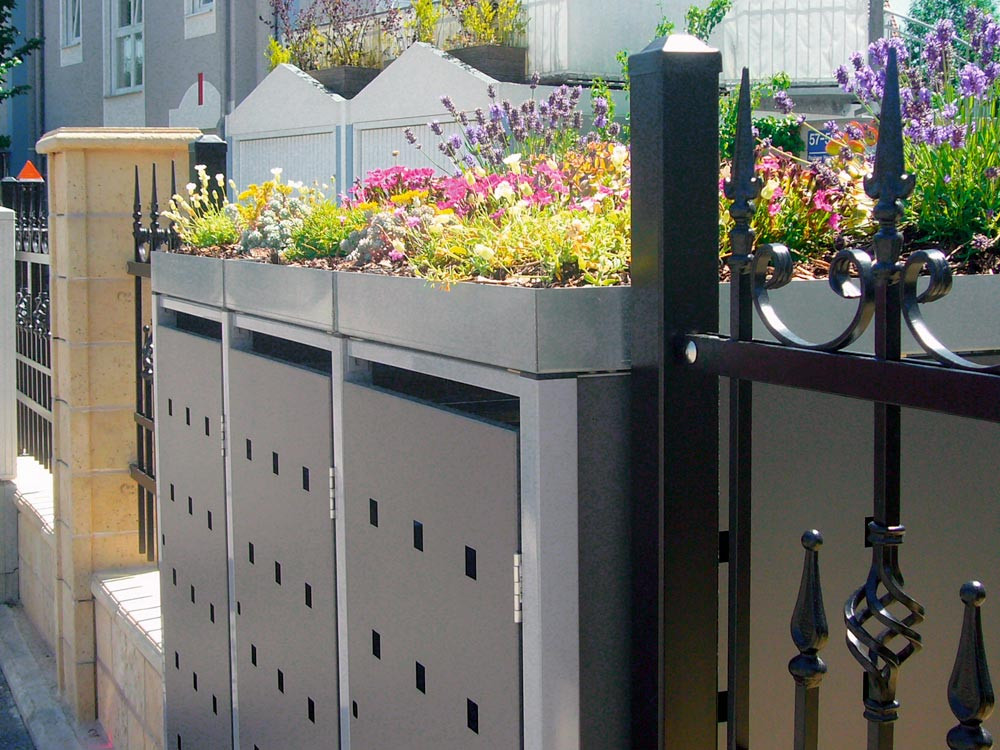 Mülltonnenverkleidung aus feuerverzinktem Stahlblech, BxTxH 680x830x1215 mm m. Pflanzdach, für 1 Tonne, Stanzung 3/5, Farbe RAL7004/RAL9006 E1982673