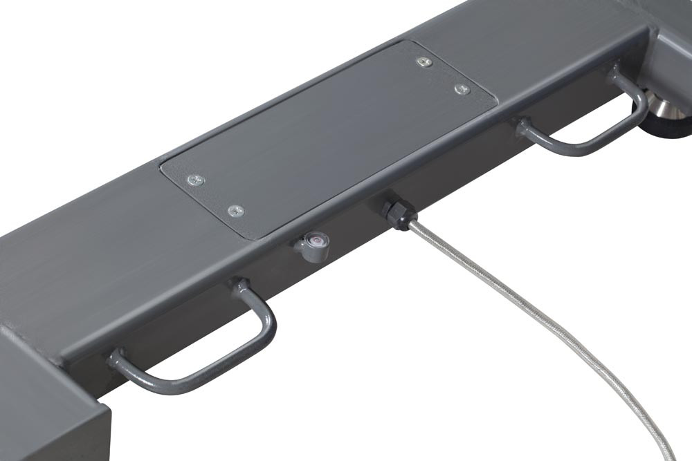 · Nicht eichfähig · Lastaufnahme aus pulverbeschichtetem Stahl · 4 silikonbeschichtete Aluminium-Wägezellen · Staub- und Spritzwasserschutz nach IP67 · Bequemer Transport und Lagerung dank Rollen und Tragegriffen