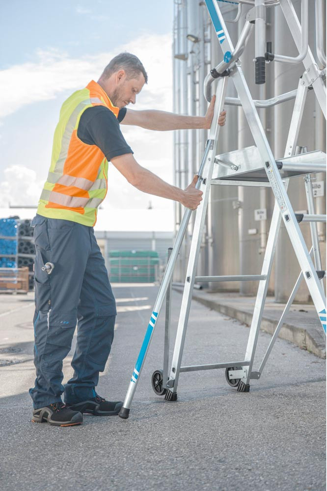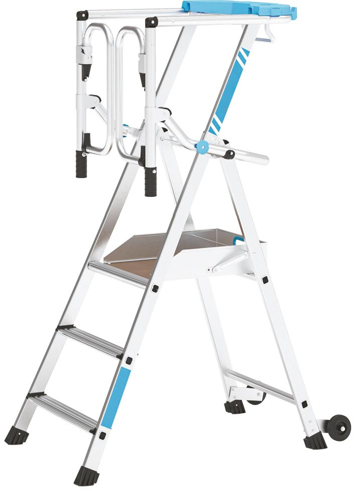 · Stufen aus Aluminium, 80 mm tief · Geländerhöhe 1,00 m · Plattformgröße 400 x 550 mm · Plattform aus verleimter Sperrholzplatte · Ablageschale aus Kunststoff · Absturzsicherung durch Saloon-Tür, selbstoffnend/-schliessend · Platzsparende Lagerung durch einklappbaren Korb · Standsicherheit durch Ausleger mit 1-Hand-Bedienung (ab Größe 5 Stufen) · 2 Rollen Ø 150 mm zum einfachen Transport · Entspricht EN 131-7
