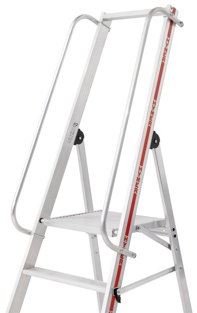 Nach EN 131 ∙ Großflächige Plattform für bequemes und sicheres Stehen ∙ Ergonomisch geformte, beidseitige Handläufe ∙ Aushängbare, starre Streben verhindern unbeabsichtigtes Zusammenklappen ∙ 80 mm Stufentiefe ∙ Plattformabmessung 440 x 400 mm