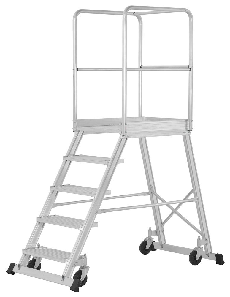 · Mit großem Sicherheitspodest 600 x 800 mm · Einseitig rutschsichere Stufen aus Alu, 200 mm Stufentiefe · 3-seitiges Geländer, Knie- und Fußleisten · 4 Federrollen, Ø 125 mm, die beim Besteigen selbsttätig bremsen · 1 Federrolle am Leiterteil mit Feststellbremse zur Sicherung gegen Wegrollen im nicht belasteten Zustand · Senkrechter Stufenabstand 243 mm · Belastbarkeit max. 150 kg · Geländerhöhe 1,03 m · Entspricht EN131-7
