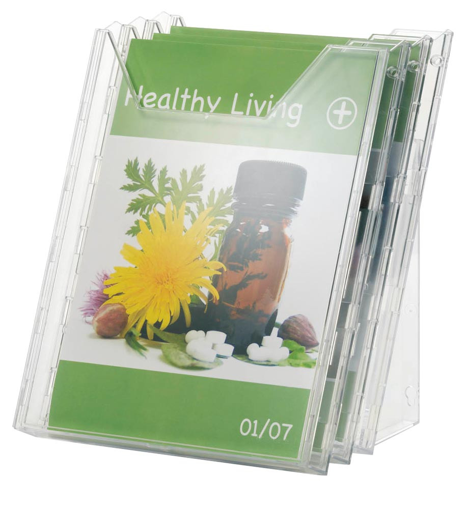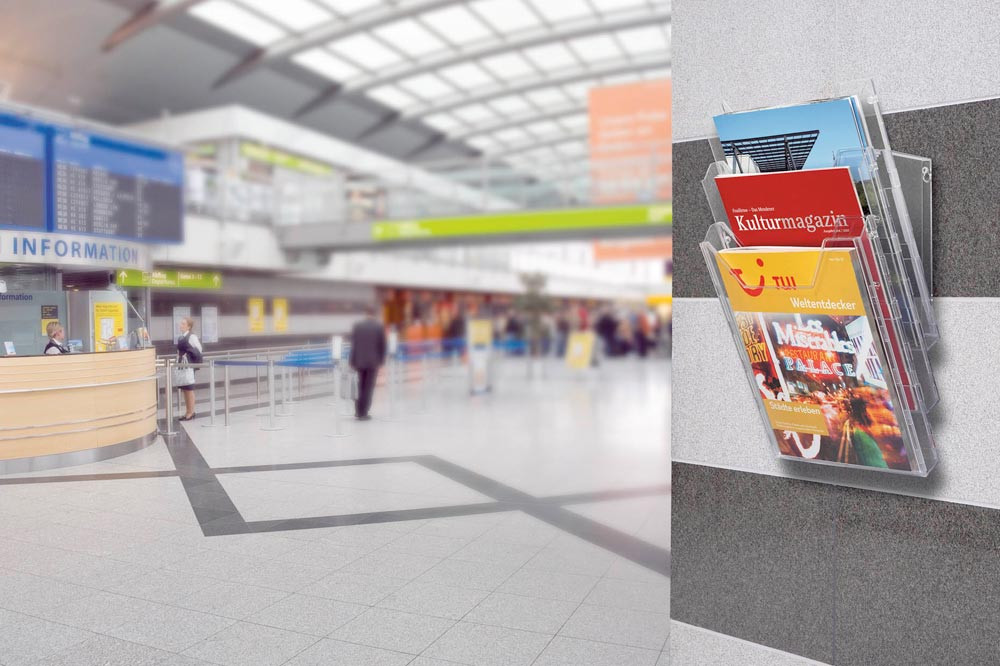 · Prospektpender als platzsparender Tischaufsteller als Wandanwendung nutzbar · Die mitgelieferten Standfüße werden einfach um 180° gedreht und der Spender kann mit dem optimalen Lesewinkel an der Wand angebracht werden · Aus schlag- und kratzfestem Polystyrol · Fülltiefe der Fächer 24 mm