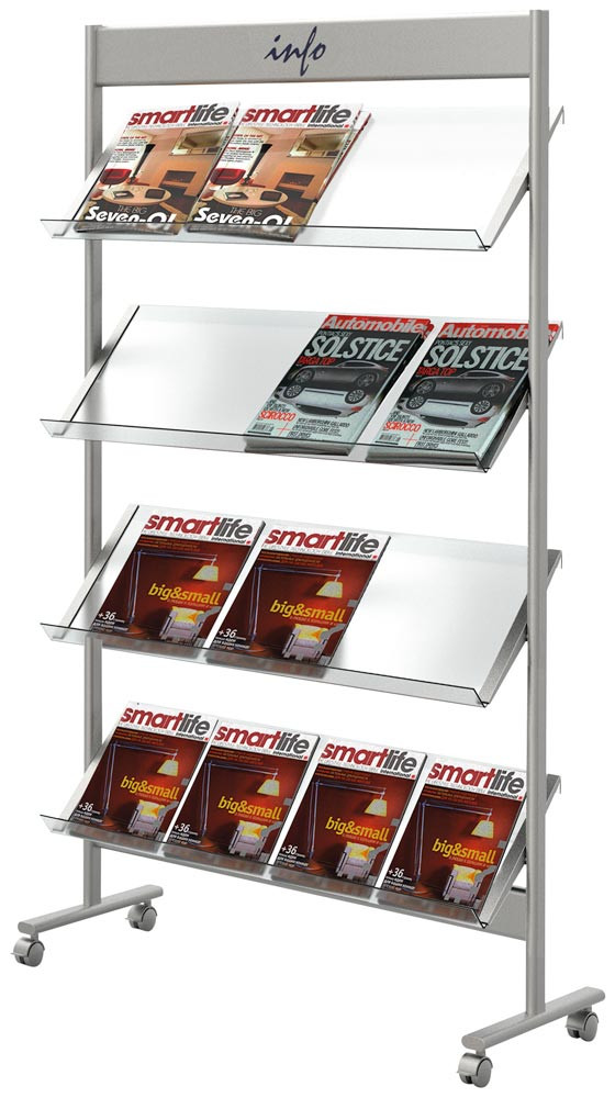 Prospektregal aus Stahl, 4 Böden aus Acrylglas für 12 x DIN A4, BxTxH 710x350x1600 mm, fahrbar, alusilber E6041240