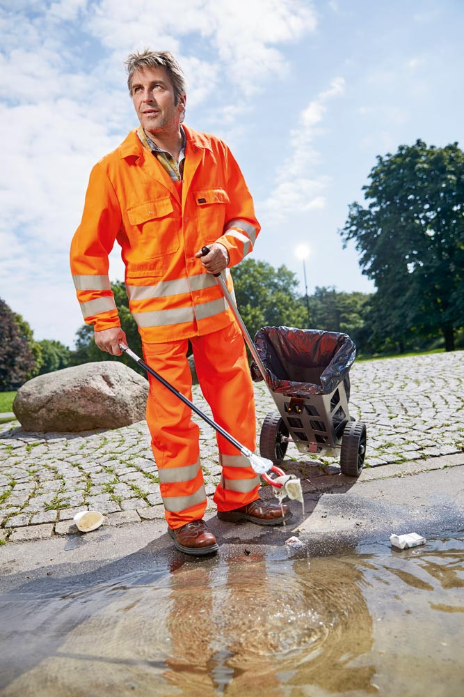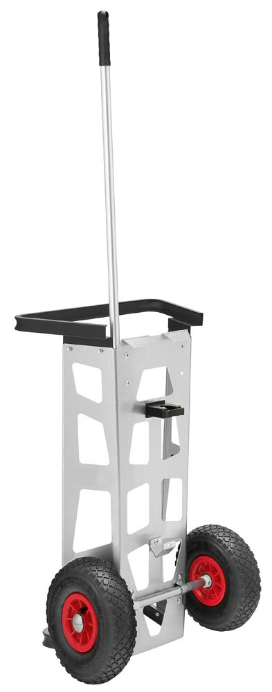 · Aus Aluminium, pulverbeschichteter Profilrahmen aus verzinktem Stahl · Besonders leicht, kompakt und beweglich · Mit 10" Luftbereifung für den regelmäßigen Einsatz, auch im schwierigen Gelände · Halterung für Müllsäcke mit Volumen 120 Liter und Abfall-Sammelzange