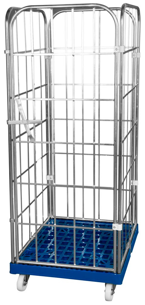 ∙ 2 Seitenwände, 1 Rückwand und 1 Tür, galvanisch blau verzinkt ∙ Robuste Rohrkonstruktion Ø 22 mm ∙ Ausfachungen mit 4 senkrechten und 4 bzw. 5 waagerechten Flacheisen 12 x 3 mm ∙ Bodenplatte mit 2 Lenk- und 2 Bockrollen Ø 108 mm aus Polypropylen mit Fadenschutz und verschraubter Radachse