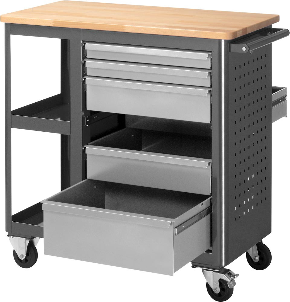 Rollwerkbank mit Bucheplatte, 6 Schubladen: 2x65, 3x125, 1x190 mm, 2 Ablagefächer, BxTxH 960x450x950 mm, RAL 7016/RAL 7035