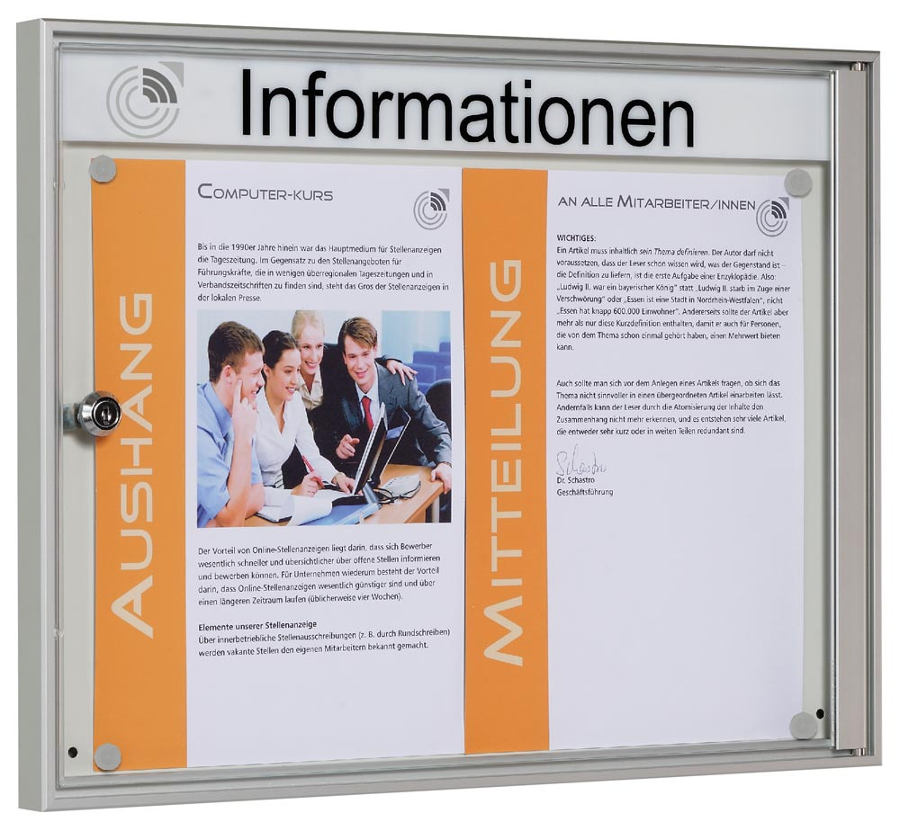 · Aus Aluminium-Profilen · Bautiefe 27 mm · Rückwand magnethaftend, Farbe grauweiß · Frontscheibe aus Einscheiben-Sicherheitsglas (ESG) · Öffnung mit Drehflügel seitlich nach rechts · Abschließbar · Entsprechen den Brandschutzbestimmungen B1 · Lieferung ohne Schriftleiste
