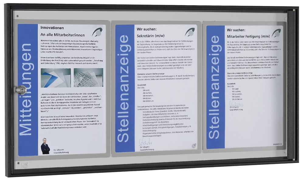 Schaukasten, BxTxH 725x27x380 mm, 3xDIN A4, Aluprofile anthrazit, ESG-Glas, Rückwand weiß, magneth.
