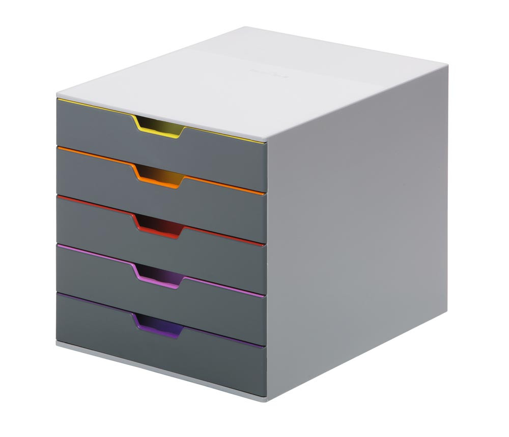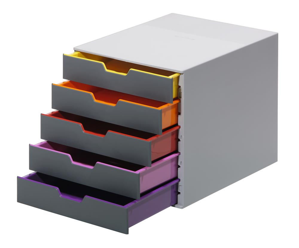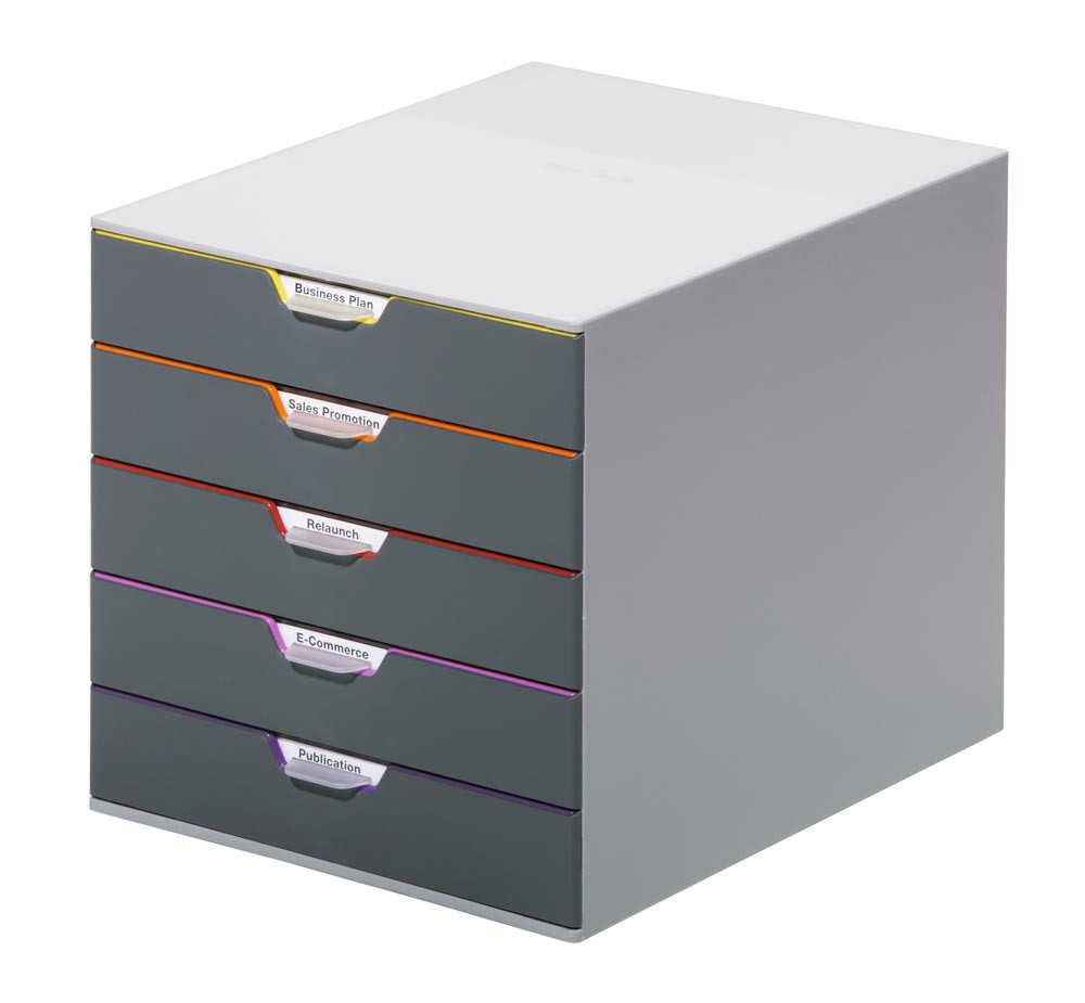Schubladenbox, BxTxH 280x356x292 mm, 5 farbige Schubladen, aus ABS, inkl. Beschriftungsfenster E851432