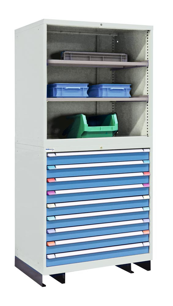 Schubladenregal, Grundfeld, 2 Verstellböden, 9 Schubladen, Traglast je 75 kg, Sockel, BxTxH 805x695x2100 mm, RAL 7035/5012 E6011351