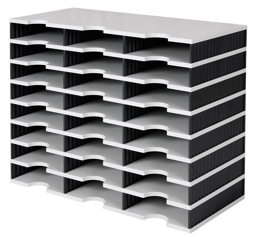· Zur Verwahrung von Kopierpapier, Zeitschriften, etc. oder als Postsortieranlage · Durch Aufbaumodule jederzeit erweiter- und kombinierbar · Aus hochbelastbarem Polystyrol · Boden in grau, Seitenteile farblich abgesetzt · Inkl. Beschriftungsschilder · Anlieferung erfolgt zerlegt im handlichen Karton