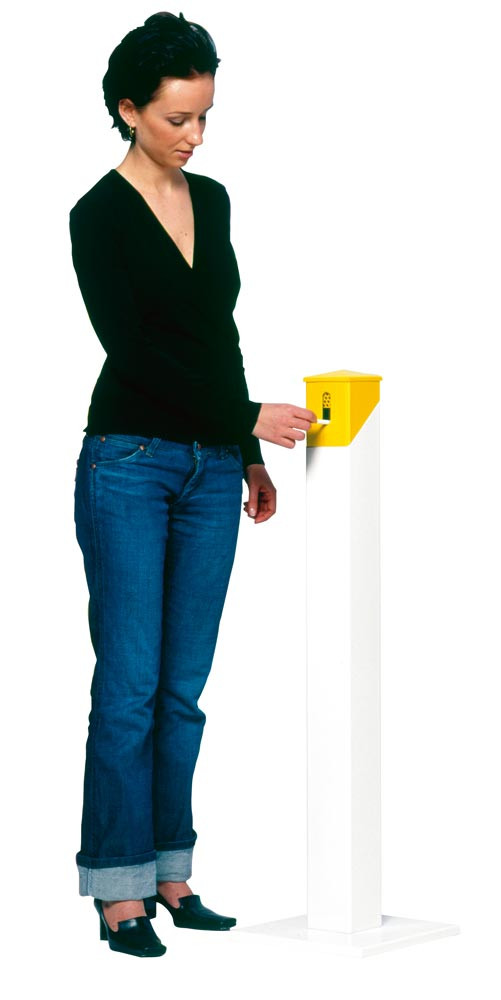 Standascher, schmal, BxTxH 300x300x1005 mm, Vol. 2,0 l, Kopfteil abnehmbar, Stahlblech pulverbesch. Korpus/Kopf weiß/gelb