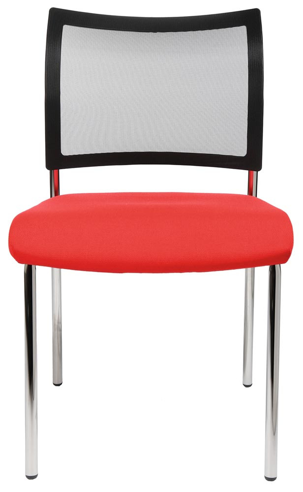 · Ergonomisch geformte Rückenlehne mit atmungsaktiver Netzbespannung und schwarzem Kunststoffrahmen · Bequem gepolsteter Muldensitz mit abgerundeter Vorderkante · Verchromtes Vierfußgestell aus Rundrohr Ø 22 mm · Kunststoff-Fußgleiter · Stapelbar bis zu 2 Stühlen · Armlehnen optional gegen Aufpreis lieferbar · VE 2 Stück