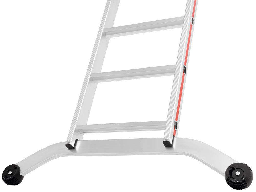 ∙ TRBS-konformes Arbeiten auf Stufen ∙ 80 mm Stufentiefe, Vorderkante mit Holm bündig ∙ Mit gebogener Traverse ab 12 Stufen (125 mm Bodenfreiraum) ∙ Leiterfüße mit Holm verschraubt und leicht auswechselbar bis 10 Stufen · Stabile Aussteifungsstreben am Antritt bis 10 Stufen · Leiterinnenbreite 370 mm · Zulässige Belastung 150 kg · Entspricht EN 131
