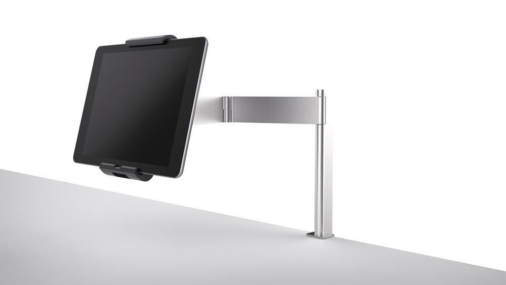 · Variables Aufnahmemodul für alle Tablet-Größen von 7" bis 13" · Symmetrische Öffnung von 160-275 mm · Einfaches Einsetzen und Entnehmen des Tablets · Gummierte Oberflächen zum Schutz der Tablets vor Beschädigungen · 360° drehbar für Hoch- und Querformat mit Rasterpunkten bei jeweils 90° · Langloch im Haltearm ermöglicht die Stromzuführung mittels Ladekabel · Diebstahlsicherung durch Verriegelung des Halters mit Spezialschlüssel · Wirkungsvoller Schutz vor seitlichem Herausziehen des Tablets · Farbe: metallic-silber