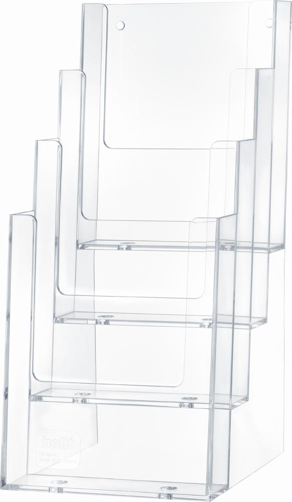 freistehend · Kunststoff glasklar · 4 Fächer für Prospekte im Format A4 hoch · zur Wandmontage geeignet