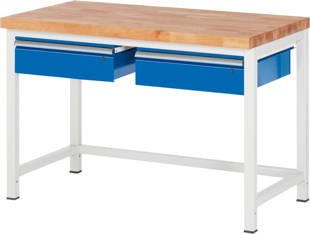 Werkbank, BxTxH 1250x900x840-1040 mm, 2 Schubladen 150 mm, Platte Buche 40 mm, RAL 7035/5010 E6490637