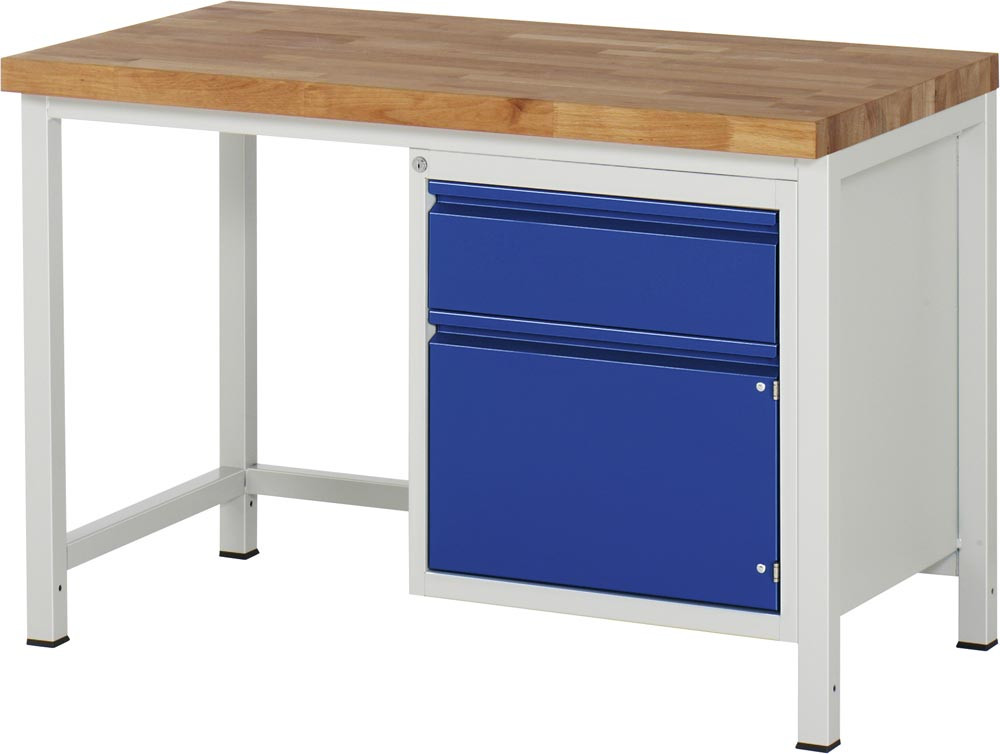 Werkbank, BxTxH 1250x700x840 mm, Platte Buche 40 mm, 1 Schublade 150 mm, 1 Tür 360 mm, RAL 7035/5010 E1978787