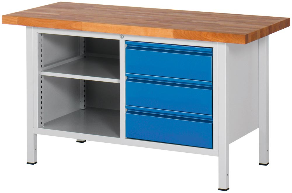 Werkbank, BxTxH 1500x700x840-1040 mm, Platte Buche 40 mm, 3 Schublade 180 mm, 1 Fachboden, RAL 7035/5010