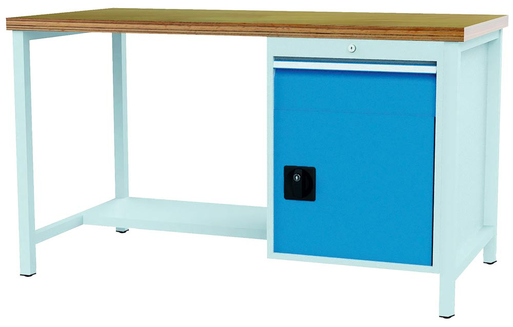 · Geschweißte Stahlblechkonstruktion · Arbeitsplatte Buche-Multiplex 40 mm · Tragkraft 1000 kg (bei gleichmäßig verteilter Last) · Gewicht 86 kg · 1 Stahlfachboden (1/2 Breite) · 1 Flügeltüre H 450 mm mit Zylinderschloß · 1 Schublade H 150 mm, 100% Vollauszug, Tragkraft 100 kg (bei gleichmäßig verteiter Last) · Hochwertige Pulverbeschichtung Rahmen: RAL 7035 Lichtgrau und Fronten RAL 5012 Lichtblau