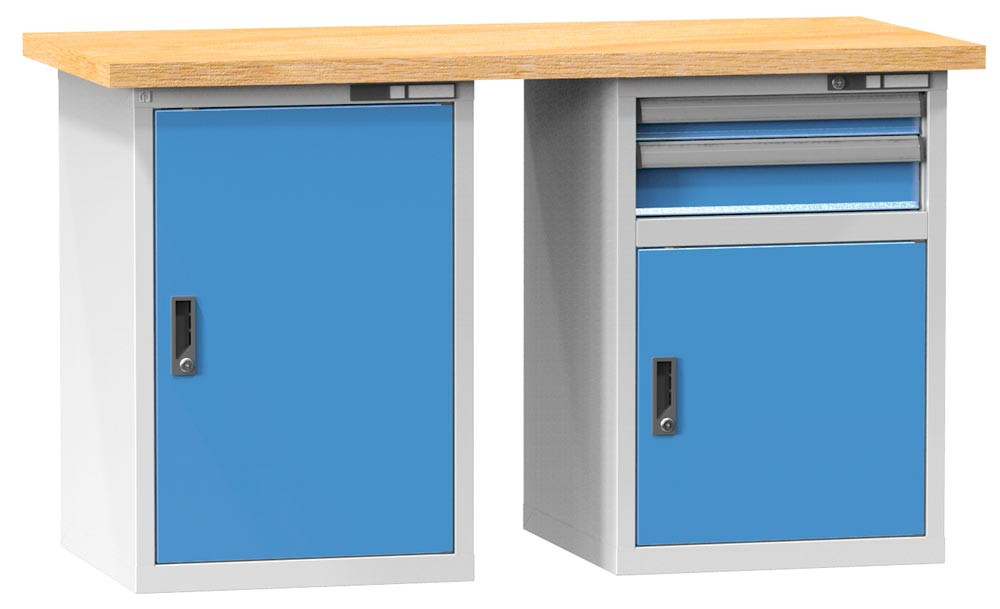 Werkbank, BxTxH 1500x800x880mm, 2 Blöcke, 2 Türen, 2 Schubladen 75, 125 mm Traglast 1100 kg, RAL 7035/5012 E6423894