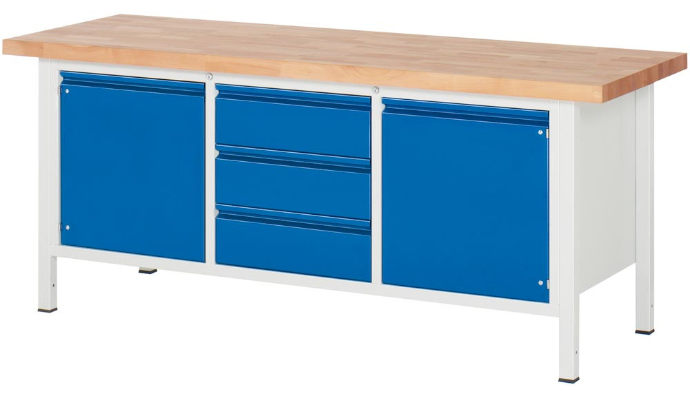 Werkbank, Platte Buche 40 mm, BxTxH 2000x700x840 mm, 3 Schubladen 180 mm, 2 Türen 540 mm, 2 Fachböden, RAL 7035/5010 E839357